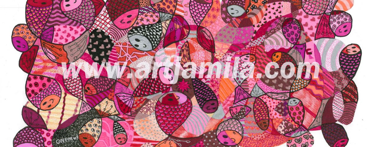 Interpretation: The Fish Mosaic series is a masterpiece of Jamila’s memories during her visit to a world heritage geopark in the fascinating island of Langkawi in Malaysia called the Kilim Geological Park. Jamila draws her own interpretation of the different kinds of fish and marine creatures in a way of drawing them in a clump to show the art of togetherness. Her special inborn power of imagination and assimilation of patterns and colours in the fish mosaic makes her art different and unique. She has created a unique masterpiece of her memories in the form of collaged patterns of marine creatures.