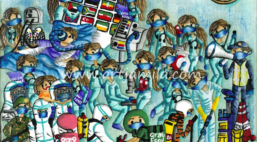 Interpretation: The COVID 19 global pandemic has shaken the world. The whole world is fighting a war. We are in a battle with an invisible killer CORONAVIRUS. Health workers are on the frontlines fighting against the enemy, not with weapons and guns, but with medical equipment and tender loving care. They are using their internal strength to the fullest to overcome the challenges of their exhausting task. The army, police and firemen guarding the movement control order are in this as well. The firemen, cleaners and volunteers sanitise and give others the support they need. They are OUR HEROES. Thank you for your hard work and dedication to many nations worldwide. May God Bless You.