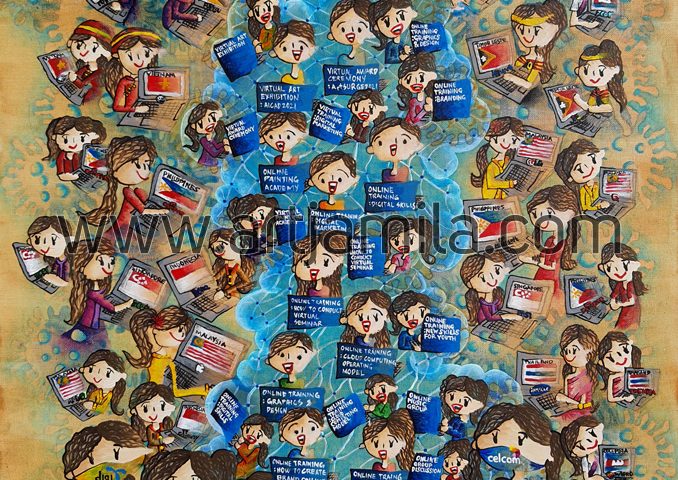 Distance is no longer an issue. Everyone from all over the world is connected through the Cloud. As seen in this painting, youth in South East Asia are wearing their traditional costumes and connected through their devices and the Cloud for attending courses, ceremonies and events online. We have learnt a lot from this pandemic. Even though we have to work and study in isolation, we can stay connected virtually through technology. We have to adapt a new way of life and learn to be resilient. Everything is superimposed with the virus in the background to indicate that we must learn to live with the virus for a long time and adapt to the new normal of doing things.