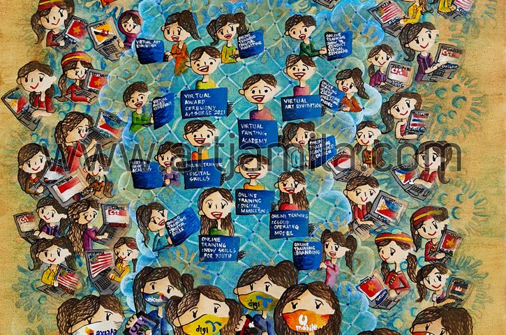 Distance is no longer an issue. Everyone from all over the world is connected through the Cloud. As seen in this painting, youth in South East Asia are wearing their traditional costumes and connected through their devices and the Cloud for attending courses, ceremonies and events online. We have learnt a lot from this pandemic. Even though we have to work and study in isolation, we can stay connected virtually through technology. We have to adapt a new way of life and learn to be resilient. Everything is superimposed with the virus in the background to indicate that we must learn to live with the virus for a long time and adapt to the new normal of doing things.