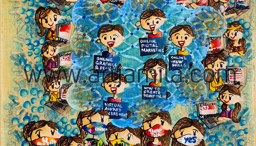 Distance is no longer an issue. Everyone from all over the world is connected through the Cloud. As seen in this painting, youth in South East Asia are wearing their traditional costumes and connected through their devices and the Cloud for attending courses, ceremonies and events online. We have learnt a lot from this pandemic. Even though we have to work and study in isolation, we can stay connected virtually through technology. We have to adapt a new way of life and learn to be resilient. Everything is superimposed with the virus in the background to indicate that we must learn to live with the virus for a long time and adapt to the new normal of doing things.