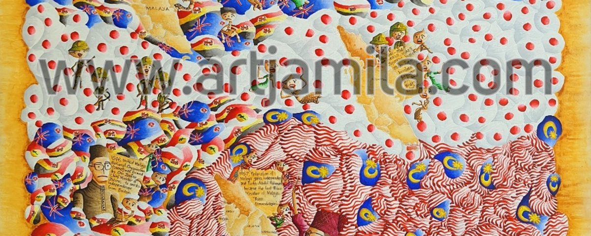 Interpretation: This painting takes us on a voyage through the history of Malaysia starting from the British colonisation in the 1700’s. The Federated Malay States was formed under British rule in 1895. During World War II, the Japanese invaded the country from 1942 to 1945. In 1946 after the war, the country sought independence from Britain and formed the United Malay National Organisation (UMNO). Under the leadership of Tunku Abdul Rahman, the Federation of Malaya gained independence in 1957. This event gave him the title of “Bapa Kemerdekaan” (Father of Independence). The country’s name was changed to Malaysia after Sabah and Sarawak joined the country in 1963. After Singapore left Malaysia in 1965, the Federal Territory of Malaysia was formed, consisting of Kuala Lumpur, Labuan, and Putrajaya. The different Prime Ministers up to 2020 are illustrated in the painting with each of their unique visions for the country.