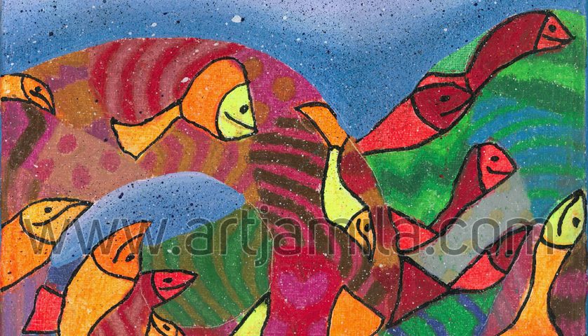 Interpretation: The Fish Mosaic series is a masterpiece of Jamila’s memories during her visit to a world heritage geopark in the fascinating island of Langkawi in Malaysia called the Kilim Geological Park. Jamila draws her own interpretation of the different kinds of fish and marine creatures, which were seen during a boat ride in the middle of the clear sea water. Her special inborn power of imagination and assimilation of patterns and colours in the fish mosaic makes her art different and unique. She has created a unique masterpiece of her memories in the form of collaged patterns of marine creatures with a complex whole profile of waves in the clean sea. The marine life in the water are seen riding high with the waves, higher and higher, seeking victory.