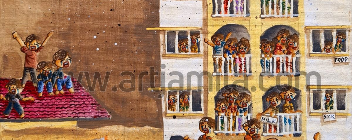 Interpretation: The climate is changing rapidly around the world. This painting shows Malaysia’s recent situation of flash flooding that caused many people to be stranded in their own homes.
