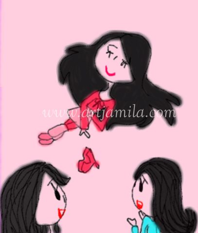 Interpretation: Jamila loves travelling. Most of her travels during her childhood are with her mother and younger sister. “THREE LADIES” was inspired by those memories.