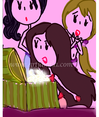 Interpretation: Jamila loves travelling. Most of her travels during her childhood are with her mother and younger sister. “THREE LADIES” was inspired by those memories.